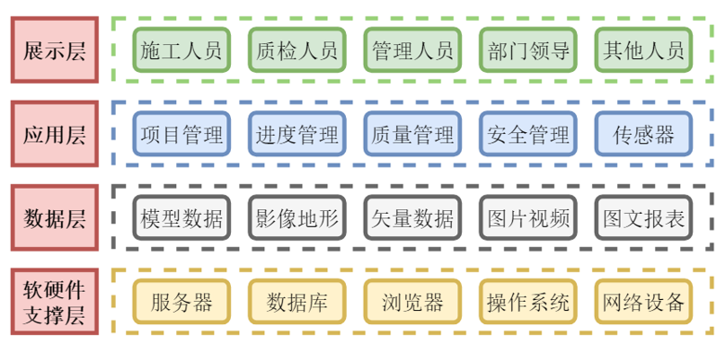 系统整体采用B/S架构,功能模块采用SOA开发体系,在整体架构上分为四层:软硬件支撑层、数据层、应用层、展示层。各层如下图所示。