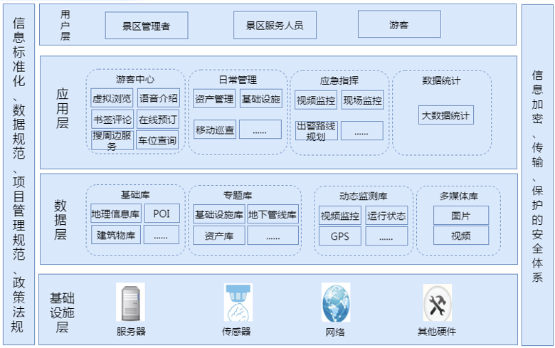 智慧景区解决方案是指通过利用GIS、大数据、云计算、虚拟化和物联网等新技术将景区的资源、服务、管理和应用系统进行整合,以提高应用交互的明确性和灵活性,从而实现基于GIS的智慧化景区服务与管理。