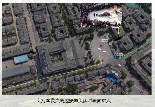景区往往人流量较大,突发情况发生后,警力不容易马上到达现场。平台可通过指挥中心的实景三维模型展示平台规划合理的出警路线,动态展示出警车辆位置和行进情况。通过接入实时监控画面,全方位展现案发现场情况