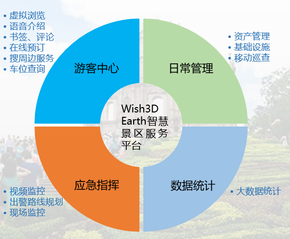 Wish3D Earth智慧景区服务平台主要是一个平台四大类应用: