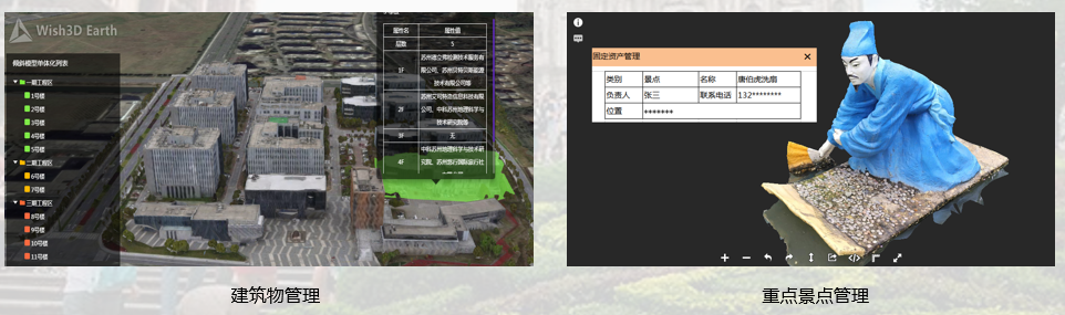对景区的建筑物、设备、文物和陈列品等固定资产进行可视化的管理,如查看空间分布、详细信息等,方便管理者查询浏览。